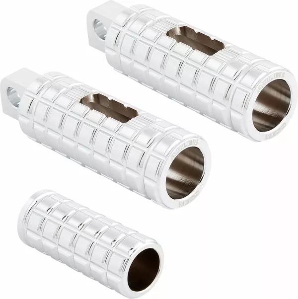 Cush footpegs feature an oversized honeycomb rubber design that reduces vibration & knurled diamond pattern for increased foot traction