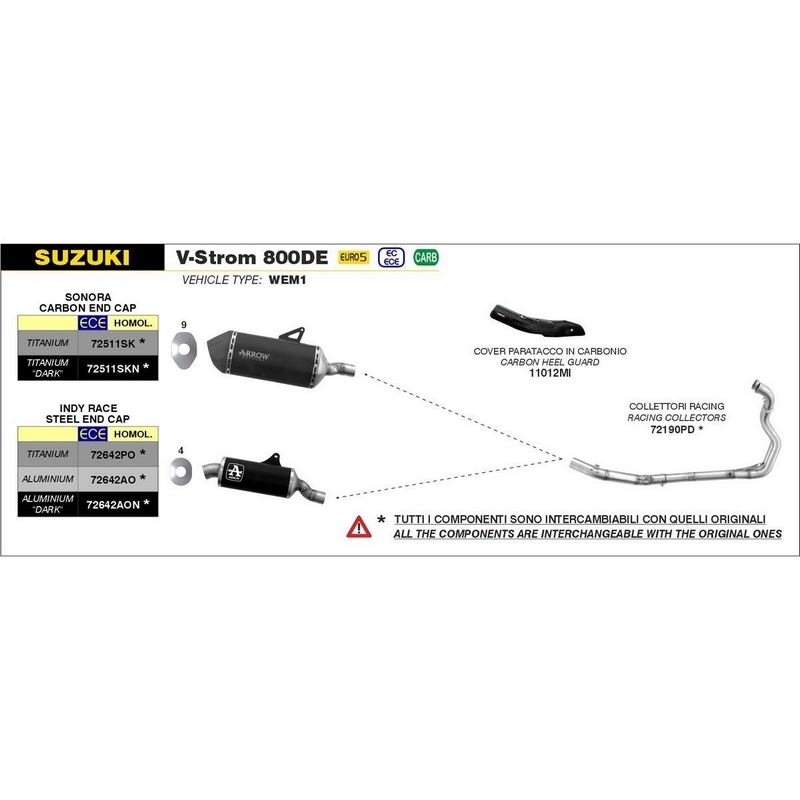 This product is considered “replacement part” as per CARB requirements only when the original catalytic converter(-s) are not been modified or replaced and when no modifications are made on ECU settings and to exhaust sensors. No Executive Order has been granted to or has been required by Arrow Special Parts S.p.A. nor to its subsidiaries or authorized representatives.