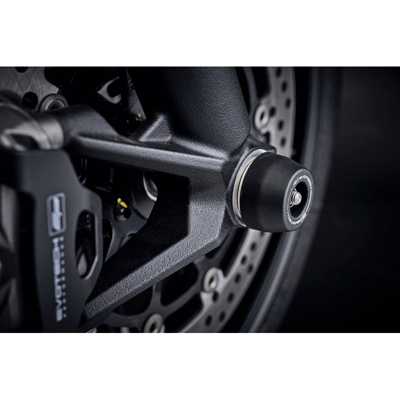 Offering protection to the wheel spindle, lower front forks, brake calipers and swingarm. EP spindle bobbins are discreet yet strong. The black bobbins sit snugly either side of the wheel spindle, held in place by a rolled-thread spindle rod. The durable materials of injection-moulded nylon and aluminium hope to be first to receive impact should an incident occur. Additionally, the nylon outers are able to twist with impact to reduce stress and wear on the wheel and bobbins.