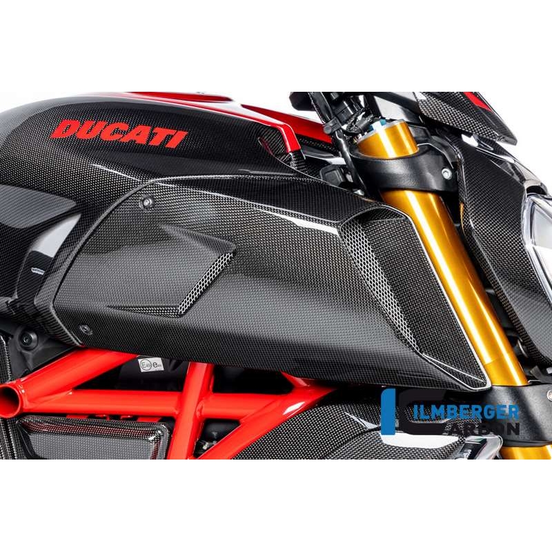 The carbonfiber Airtube cover right side with gloss surface for the Ducati Diavel 2019 is a direct replacement for the original component and contributes mainly to weight saving on the motorcycle and a higher stiffness of the parts.